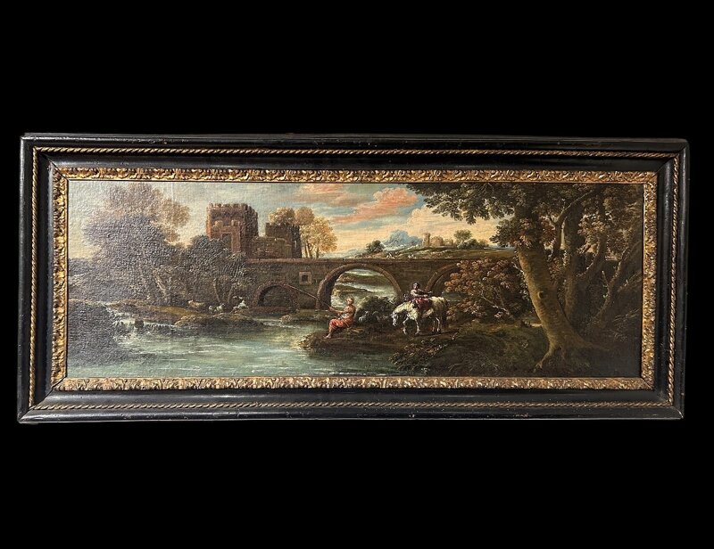 Questo bellissimo sovrapporta provvisto di cornice coeva è stato dipinto ad olio su tela e raffigurante un paesaggio agreste con presenza figure di viandanti lungo il fiume Aniene, una impegnata a pescare e l'altra in attesa su di un cavallo bianco. Infatti, sembrerebbe che il ponte raffigurato dal pittore sia ponte Mammolo appena fuori Roma, dandoci la possibilità di vedere come si presentava nel corso della seconda metà del '600.