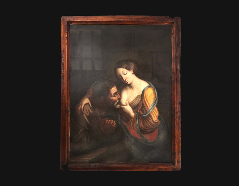 Interessante olio su tela di grandi dimensioni raffigurante rappresentazione della Carità romana, Il dipinto è stato eseguito da un valente pittore della ambito romano della seconda metà del secolo XVII ed è stilisticamente legato agli esiti artisticiv di un grande maestro del tempo il pittore perugino Gian Domenico Cerrini (Perugia, 1609 – Roma, 1681), che died vita ad un vero e proprio prototipo di questa rappresentazione che fece da modello per altri pittori a seguire, ed oggi, conservata alla galleria nazionale dell'Umbria a Perugia. Nel nostro caso non si tratta di una copia pedissequa, ma di un elaborazione personale di questo pittore, tratta da quella del maestro perugino. Probabile che possa uscire dalla bottega romana del pittore perugino nel periodo di tarda attività oppure da stretto seguace degli anni '80 del seicento..