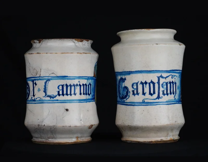 Bellissima coppia di vasi da farmacia prodotti nelle botteghe di ceramisti durantini alla metà del XVI secolo, dunque, attivi nell'odierna Urbania.