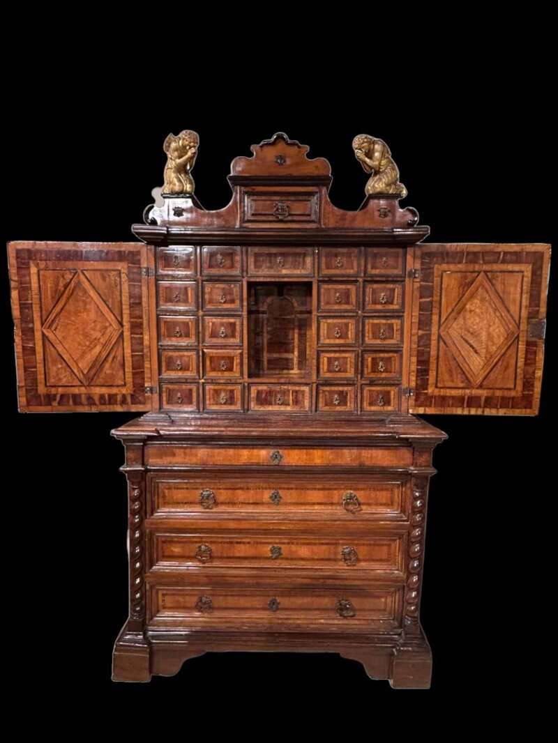 Il doppio-corpo finemente radicato in noce si caratterizza per i sontuosi giochi di radica ed intarsi in legno di acero, inquadrate da modanature intagliate sui sportelli e sui cassetti. Inoltre, prevede delle semicolonne tortili intagliate che ci permettono di condurre l'epoca di produzione all'ultimo quarto del Seicento in pieno periodo Luigi XIV. Anche la particolare ed imponente cimasa contiene un cassetto ed ha inserti in legno d'ebano, che fanno da riccetti alle eleganti curve del mobile.