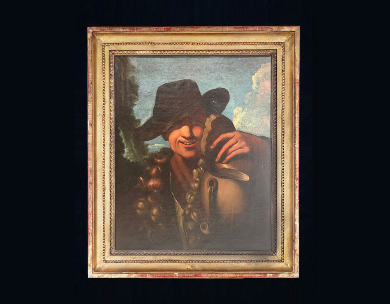 Simpatico dipinto eseguito ad olio su tela caratterizzato da una notevole qualità pittorica e raffigurante un giovanotto con treccie d'aglio e di cipolle rosse, un pezzo di pane e un'otre di vino sulla spalla. Il giovane è rappresentato con delle umili vesti, un grande copricapo per coprire gli occhi dal sole ed un fiero sorriso.