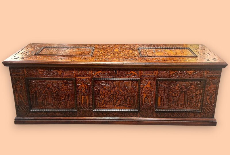 Splendido cassone cinquecentesco in profumato legno del libano tipico dell'area veneziana, ma anche dell'alto Veneto e del Friuli. Il ricco frontale è scandito da tre quadri intagliati e decorati a pirografo e china con paesaggi e scene di genere e commemorazione famigliare ed ognuna è riquadrata da cornici a guillochè ebanizzate. Ogni quadro è scandito da 4 figure, probabilmente impersonificazioni dei 4 continenti posti entro ricchi tabernacoli absidati a trompe d'oeil, il tutto sovrastato da giochi di putti alati e candelabre.