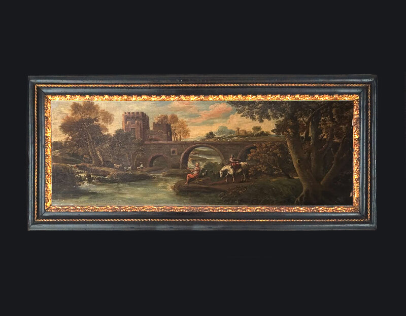 Questo bellissimo sovrapporta provvisto di cornice coeva è stato dipinto ad olio su tela e raffigurante un paesaggio agreste con presenza figure di viandanti lungo il fiume Aniene, una impegnata a pescare e l'altra in attesa su di un cavallo bianco. Infatti, sembrerebbe che il ponte raffigurato dal pittore sia ponte Mammolo appena fuori Roma, dandoci la possibilità di vedere come si presentava nel corso della seconda metà del '600.