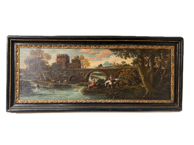 Questo bellissimo sovrapporta provvisto di cornice coeva è stato dipinto ad olio su tela e raffigurante un paesaggio agreste con presenza figure di viandanti lungo il fiume Aniene, una impegnata a pescare e l'altra in attesa su di un cavallo bianco. Infatti, sembrerebbe che il ponte raffigurato dal pittore sia ponte Mammolo appena fuori Roma, dandoci la possibilità di vedere come si presentava nel corso della seconda metà del '600.